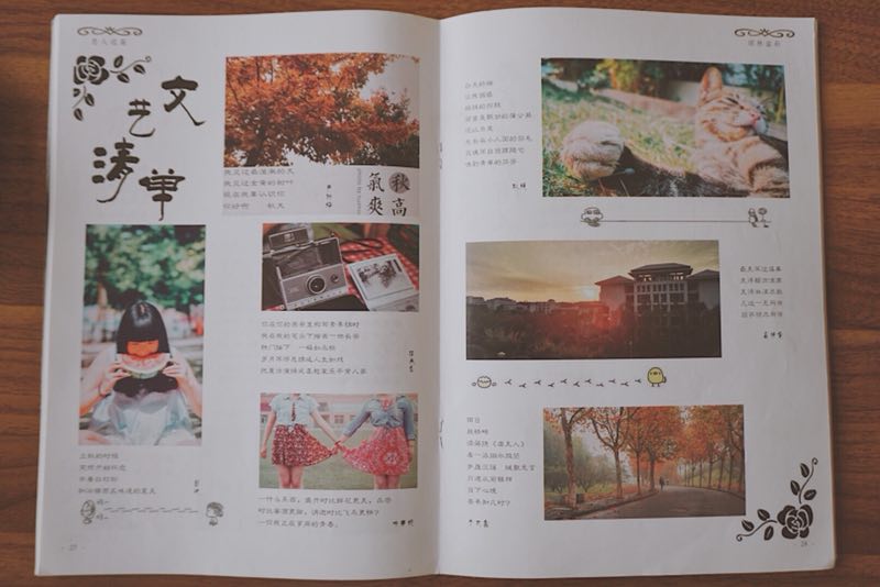 “你若遇见秋意,请替我问好”,这是我所编辑的第一本杂志的背封语,跟当时荻思文学社的小伙伴们一起跟着教程从零开始学习制作,编辑完成后,我们不断讨论了影印机构、打印纸张、封面形式等等,过程中栽了很多跟斗,但大家一直互相鼓励,直至最后完成发刊,我们拿着杂志,把“这是我们的孩子”当玩笑话说出来,但又何尝不是我的心声。有了经验后,杂志编辑便没有一开始那么艰辛。2016年5月,王军老师给了我编辑制作 污污漫 与荻思合作的杂志的机会,那是13级 污污漫 小说专刊,其中我个人认为比较“特别”的一点是,这本杂志的作者署名全部是亲笔手写,收集签名的过程是无比欢乐的,之后的编辑过程中看到这些签名,不由产生“见字如面”的感想,会情不自禁地按照个人特色为他们编辑。不仅对学长学姐们,这本杂志对我来说也非常特别,之后老师和学姐严格的校对和更改让我对它充满了信心,尤其是亲手拿到成品,那种惊喜的感觉,直到如今都记忆犹新。后来,王军老师又推荐我制作澄园书院的“澄典”杂志,杂志中刊登的是澄园书院同学的作品,内容十分丰富,这次有选稿的权利,挑选了其中比较优秀的作品进行编辑,个人比较喜欢这次杂志的风格。每次制作出可以发刊的杂志都让人十足有成就感,每一本杂志对我来说存在着特别的意义,这也成为我大学生活中难得的珍贵记忆。