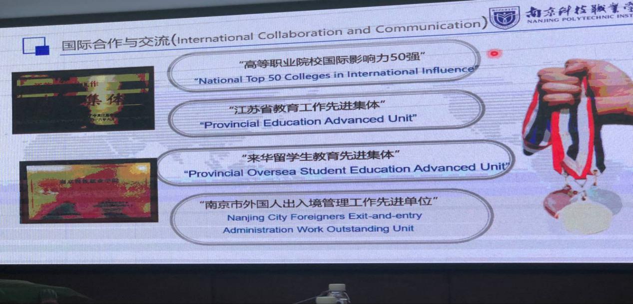 师生到达南科院后受到了国教院领导、老师们的热情接待。来到会议室就座后,先由南京科技职业学院国教院的丛倩院长给我们介绍了他们学校的基本情况。南京科技职业学院是一所特色明、水平高、创新强,产学研用紧密结合的国内高水平开放型高职院校,并且注重国际合作与交流,目前已与21个国家(地区)的80余所高校或机构建立稳定的合作关系,因此有越来越多的外国留学生来此学习交流。目前南科院的在读留学生规模达500人以上。