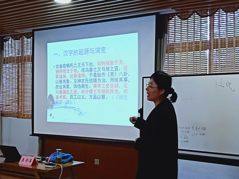 讲座伊始,栗学英老师引用了《说文解字·续》中的一段文字,挑选重要的字句进行分析,从历史的角度为同学们讲解了汉字的起源。相传汉字是由黄帝的史官仓颉创造的,而汉字是在自然物象的启迪下,依类象形而形成的。
