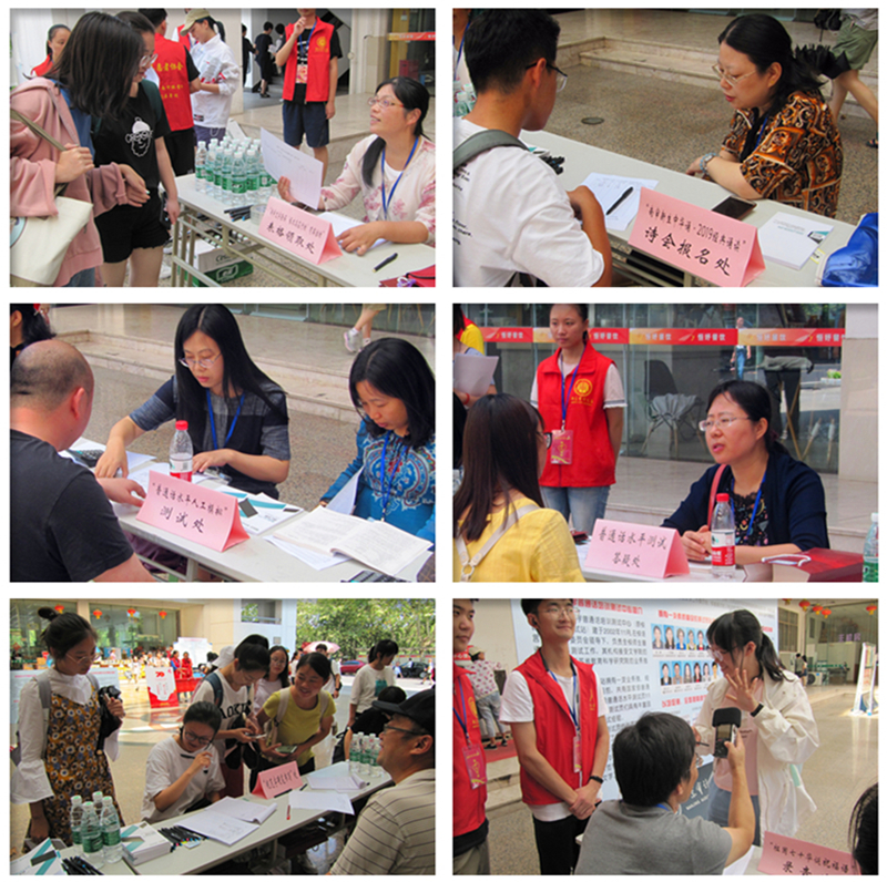 11名国家级、省级测试员组成的推普队伍,在沁园食堂一楼大厅为前来咨询的师生们热情服务。测试员老师们放弃午间短暂的休息时间,通过“共和国七十华诞祝福语录音正音”、“硬笔规范字书写”、“普通话水平人工模拟测试”、“语言文字及普测知识答疑”、“新生中华诵·2019经典诵读”诗会现场报名”、“校园文字‘啄木鸟在行动’”等活动方式热情、耐心、细致地为每一位前来参与活动师生答疑、服务,校学生会18名推普志愿者也参与到活动中,在现场向来往的师生们宣传推普活动,充分体现了 污污漫