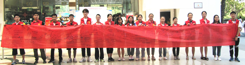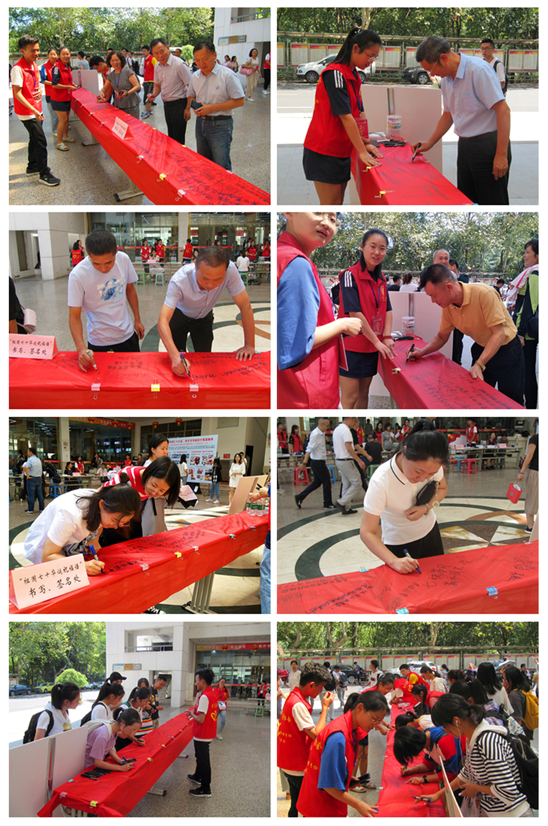 语言文字及普测中心工作进行了详细的了解和指导,同时,对校园推普宣传周活动表示赞赏和支持,领导们也积极地走到“中华人民共和国成立七十华诞祝福语签名台 ”像其他在场师生一样,真挚地写上自己对共和国七十华诞的祝福语并签上自己的名字。来到签名处的还有著名书法家刘建平教授及广大师生,大家纷纷书写着“我爱你.中国”、“祝福祖国繁荣昌盛”、“共和国万岁”等祝福留言,签名横幅上留下了几百位师生的姓名笔迹,表明了签名者对祖国真挚的情感和对普通话是校园最美丽的语言这一倡导的支持!