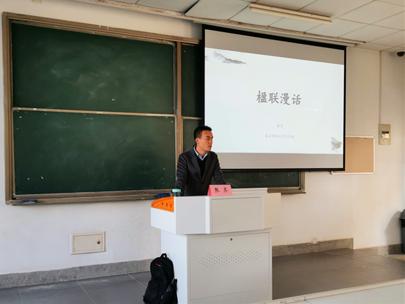 然后,张齐分析了楹联的特征,总体对仗工整,音韵和谐,重点是雅俗皆可。主要要求是字数相等、词性相同、结构相近、平仄相谐。另外,张齐介绍了楹联的类型,《楹联集成》将对联分成二十个门类:庆贺、哀挽、学校、商业、会馆等等。按单联字数分短、中、长联;按性质分为应征体、言志体、取巧体。