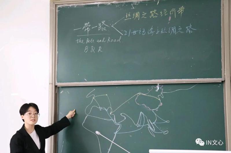 黄艳珺同学流畅地在黑板上画出一道道线条,声情并茂地详细讲解“一带一路”,深刻感受丝绸之路的伟大魅力。