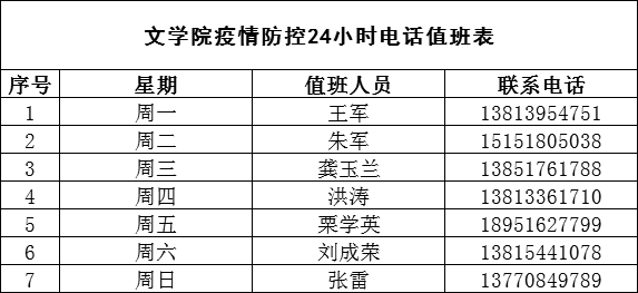 目前已经安排疫情防控24小时电话值班,值班表如下: