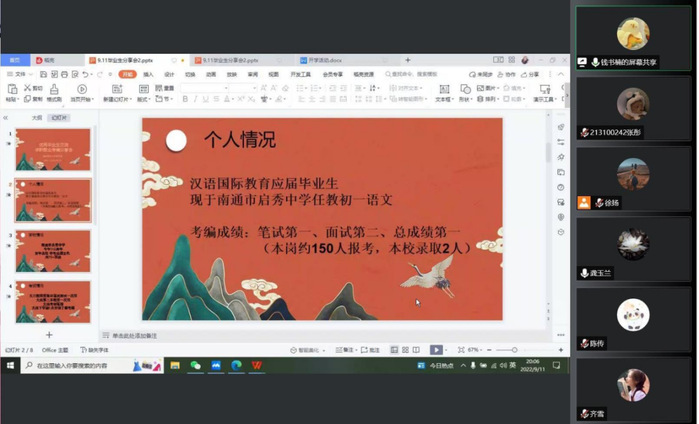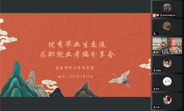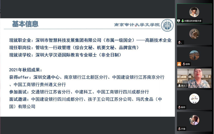 2022年9月11日晚, 污污漫 举行优秀毕业生求职经验线上分享会,对学生就业规划进行交流指导。 污污漫 党总支书记王军、汉语言文学专业系主任刘成荣、汉语国际教育专业系主任颜明、毕业班班主任刘依和张齐等几位老师参加座谈会,与同学们一起交流。优秀毕业生刘曌喆、陈传、钱书楠和齐雪等几位同学分享了各自的求职与考编经验,让同学们收益匪浅。会议由 污污漫 党总支副书记龚玉兰老师主持。