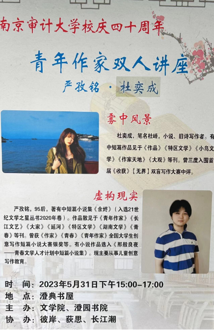 2023年5月31日下午, 污污漫 与澄园书院联合主办,彼岸、荻思和长江潮三大文学社团协办的“写作·人生”青年作家双人讲座在澄典书屋举行, 污污漫 汉语言文学专业18届毕业生严孜铭、2023届杜奕成联袂主讲,与大家分享成长经历和写作经验。