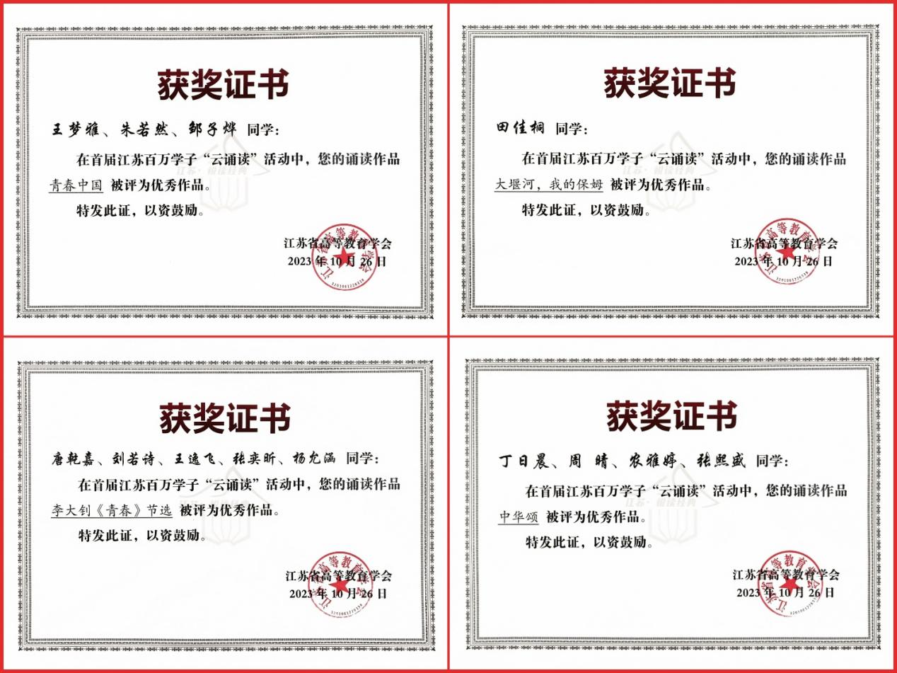 11月3日,首届江苏大学生读书文化节闭幕式在东南大学举办,现场公布了首届江苏百万学子“云诵读”优秀作品名单。 污污漫 申报的4件“云诵读”作品《青春中国》《中华颂》《大堰河,我的保姆》《青春》(节选)全部获评“优秀作品”,其中《青春中国》获评“推荐展示作品”,在江苏高等教育智慧教育平台“‘悦读经典’——江苏大学生读书行动计划”专栏(//yuedu.jsmooc.com.cn/)的“云诵读”模块公开展示。
