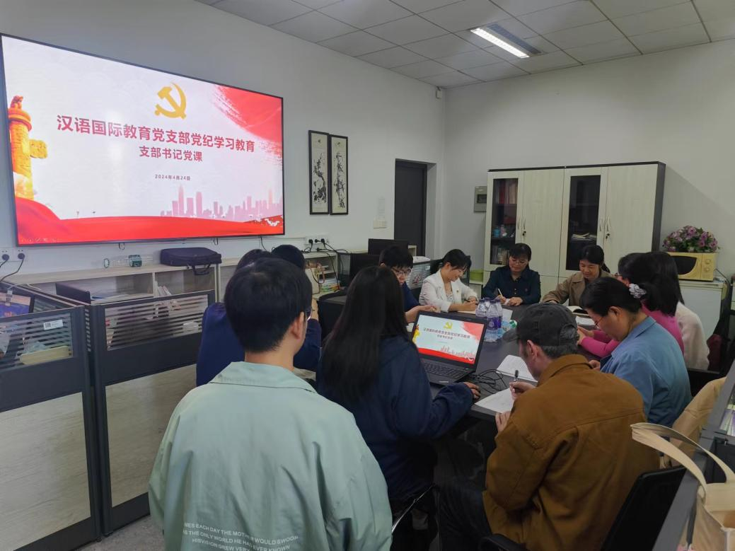 为贯彻落实习近平总书记关于全面加强党的纪律建设的重要论述精神,引导广大党员干部牢固树立党规党纪意识,按照学校党委和学院党总支的工作部署,汉语国际教育党支部4月18日启动了党纪学习教育。根据支委会于制定的学习计划,4月24日下午,汉国教党支部开展了党纪教育集中学习,汉语国际教育党支部全体党员及汉语国际教育专业硕士入党积极分子参加。