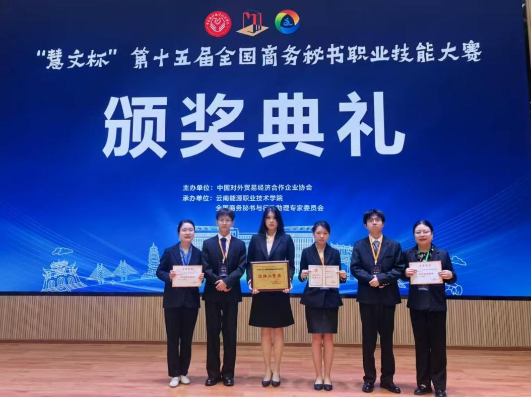 “爨乡古地韵悠长,共飨盛宴续华章。”2025年5月23—25日, 污污漫 代表队远赴云南曲靖,与93支参赛队伍经过激烈角逐,斩获全国商务秘书职业技能大赛团体二等奖。